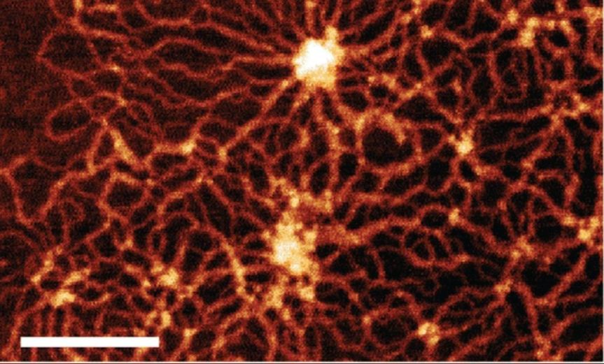 This atomic force microscopy image of DNA shows kinetoplast DNA fibril nodes. Scale bar: 150 nanometres. (A human hair is 90,000 nm wide.)